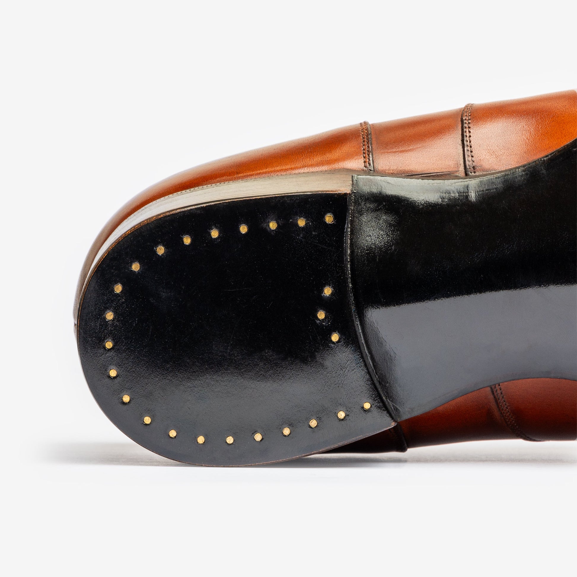 Suela: Cuero curtido con corteza de roble J&FJ Baker con Cintura biselada, clavijas de madera ocultas y tacón apilado de cuero de 9-10
