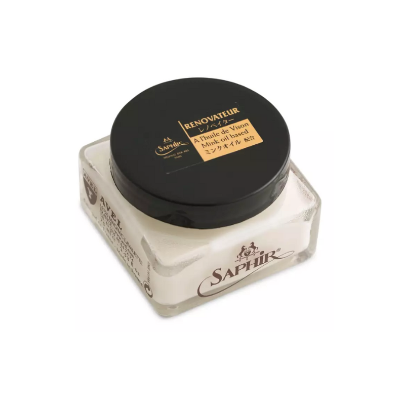 Formulated with mink oil, lanolin, and beeswax, Renovateur restores suppleness to dry or neglected leather while helping to maintain elasticity in regularly worn shoes. It is particularly effective as a pre-polish treatment, preparing the leather to better accept cream or wax polish afterward.