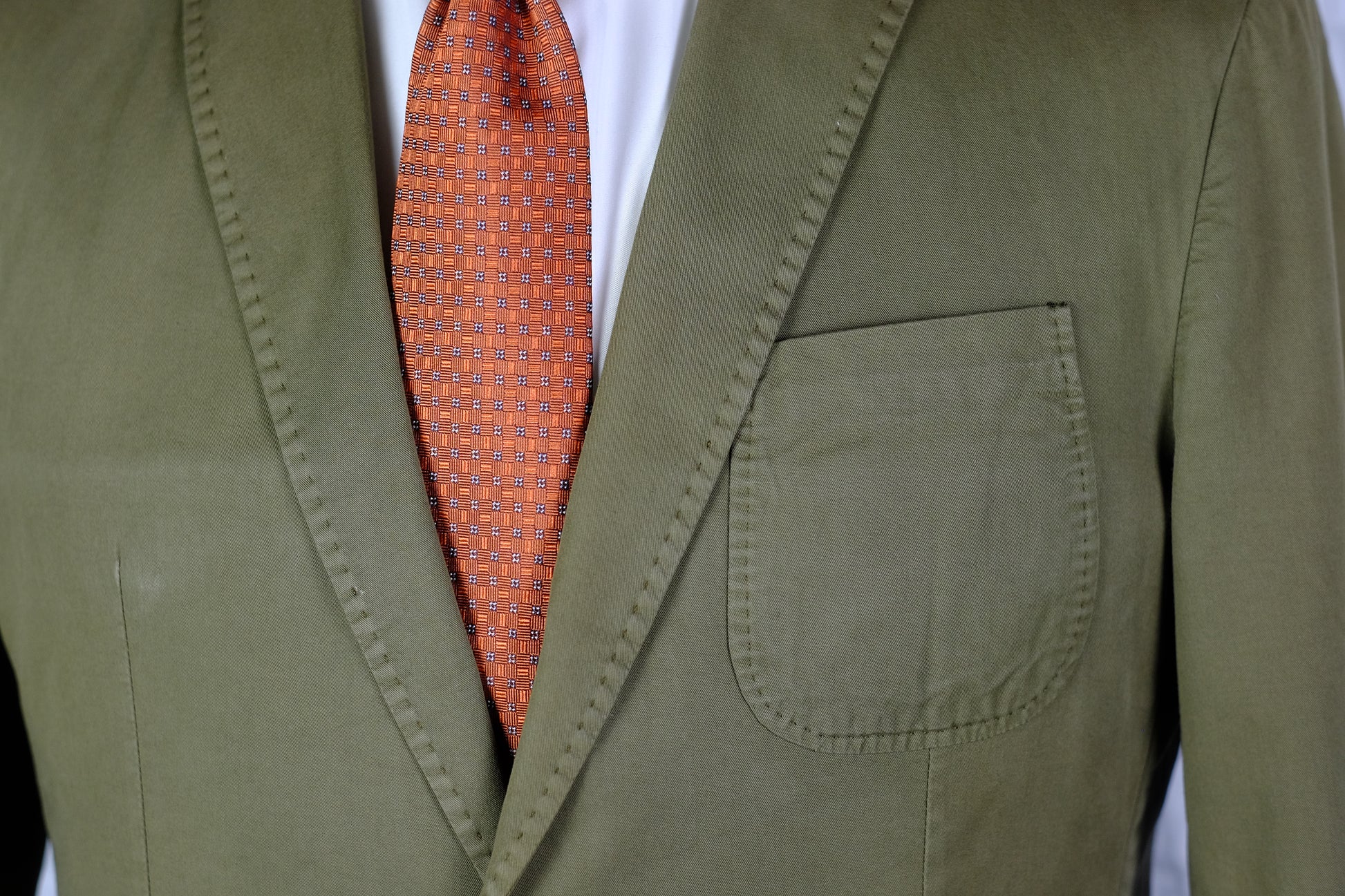 Un costume léger en coton vert olive signé Timothy Everest. Le costume idéal pour l'été.