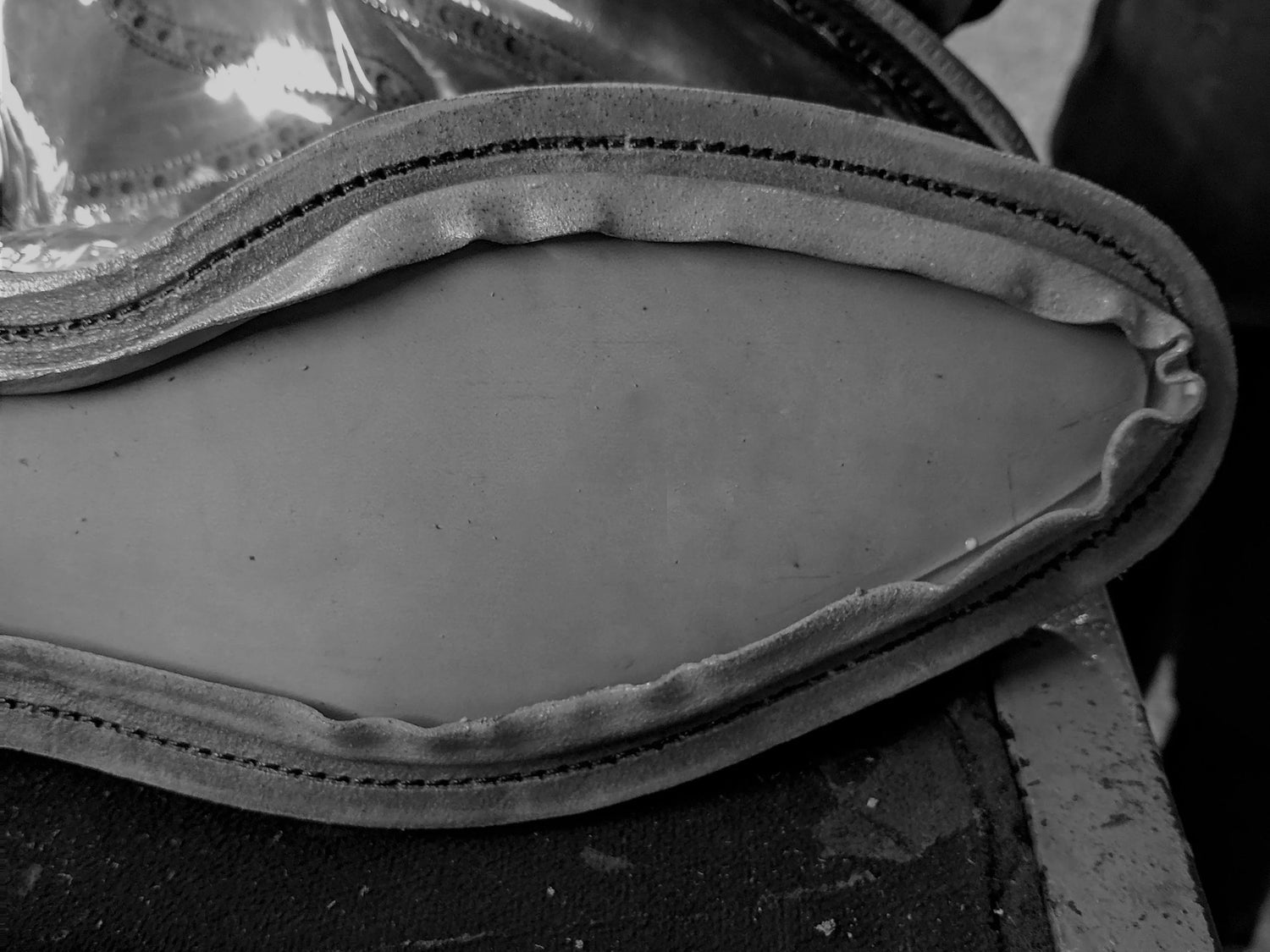 Our shoes are stitched to a leather channel on the insole unlike most factory made shoes where it is stitched to a gemmed cotton rib.