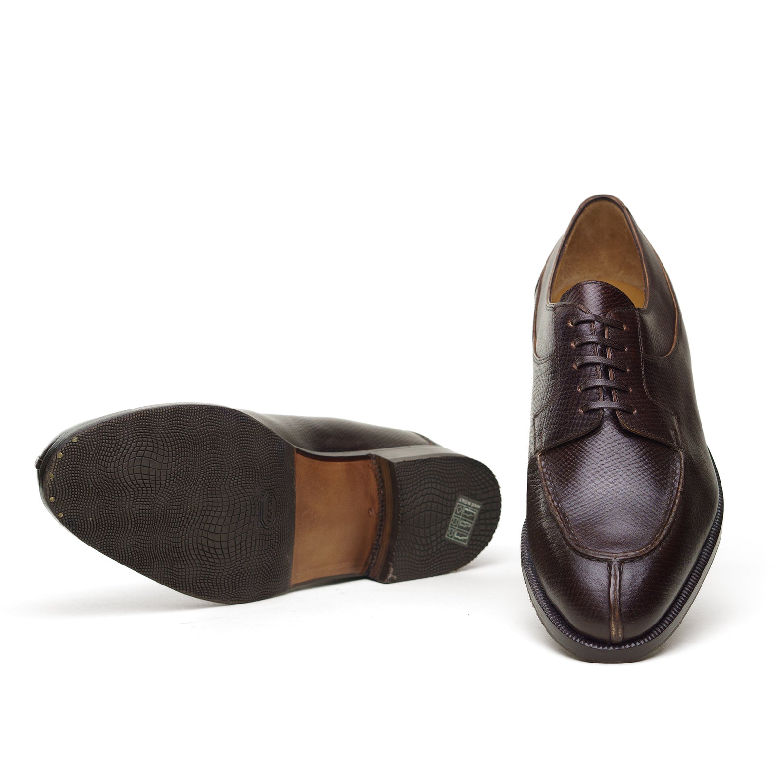 Crafted in saddle brown hatchgrain leather, this split-toe derby offers a textured, durable alternative to smooth calf while maintaining a refined profile. The hand-sewn apron adds definition and character, giving the shoe a slightly more relaxed elegance. An ideal choice for those who want versatility, structure, and quiet distinction in everyday wear.