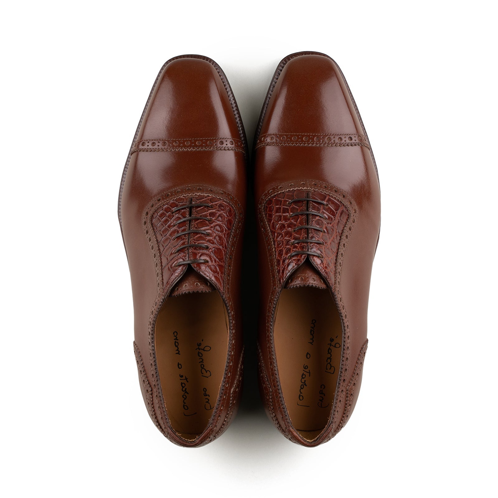 This Adelaide oxford is crafted in a rich reddish-brown leather, accented with alligator leather panels that add depth and refined texture. The seamless Adelaide pattern creates a clean, elegant line across the shoe, allowing the warm tone and material contrast to take center stage. A sophisticated choice that balances classic form with elevated detail.