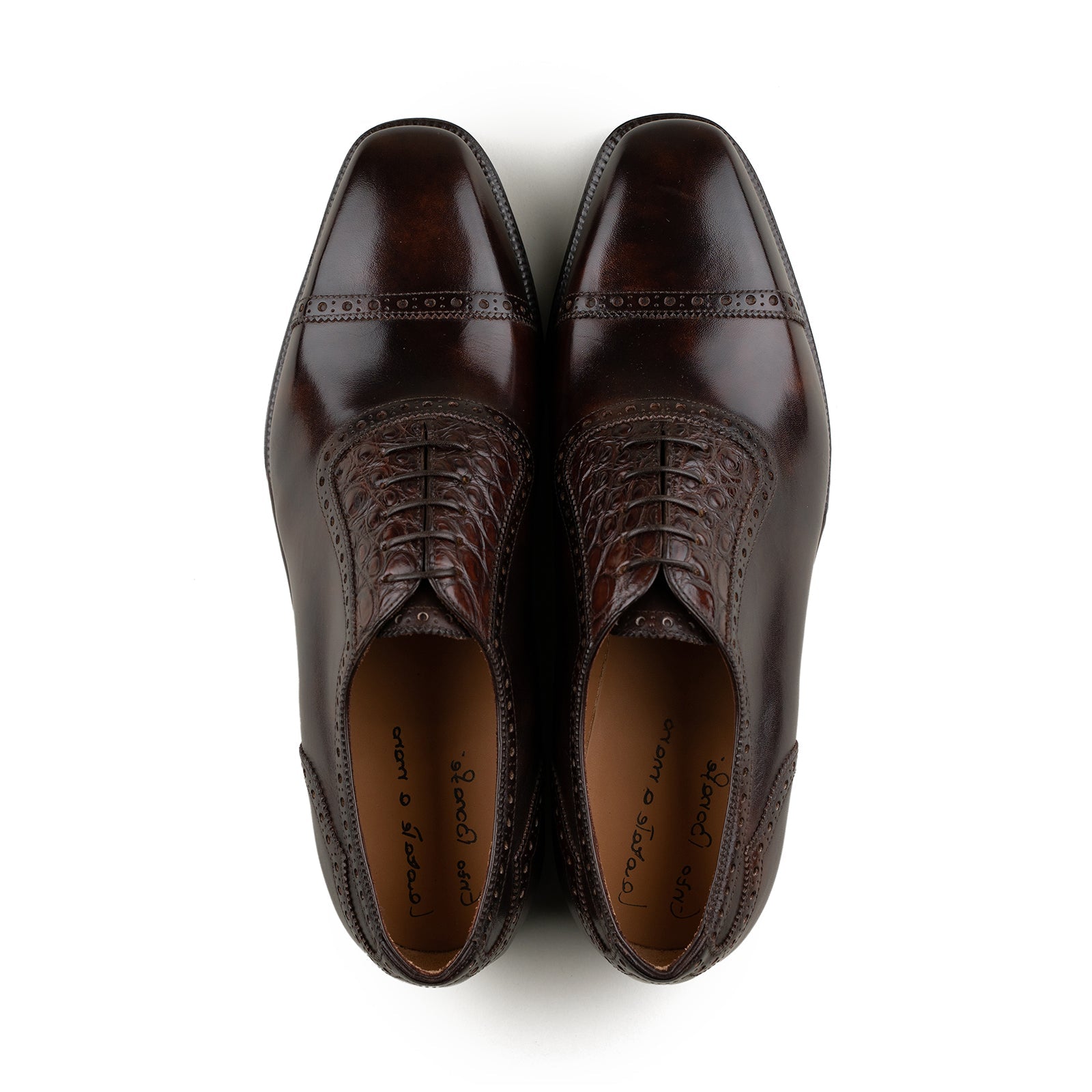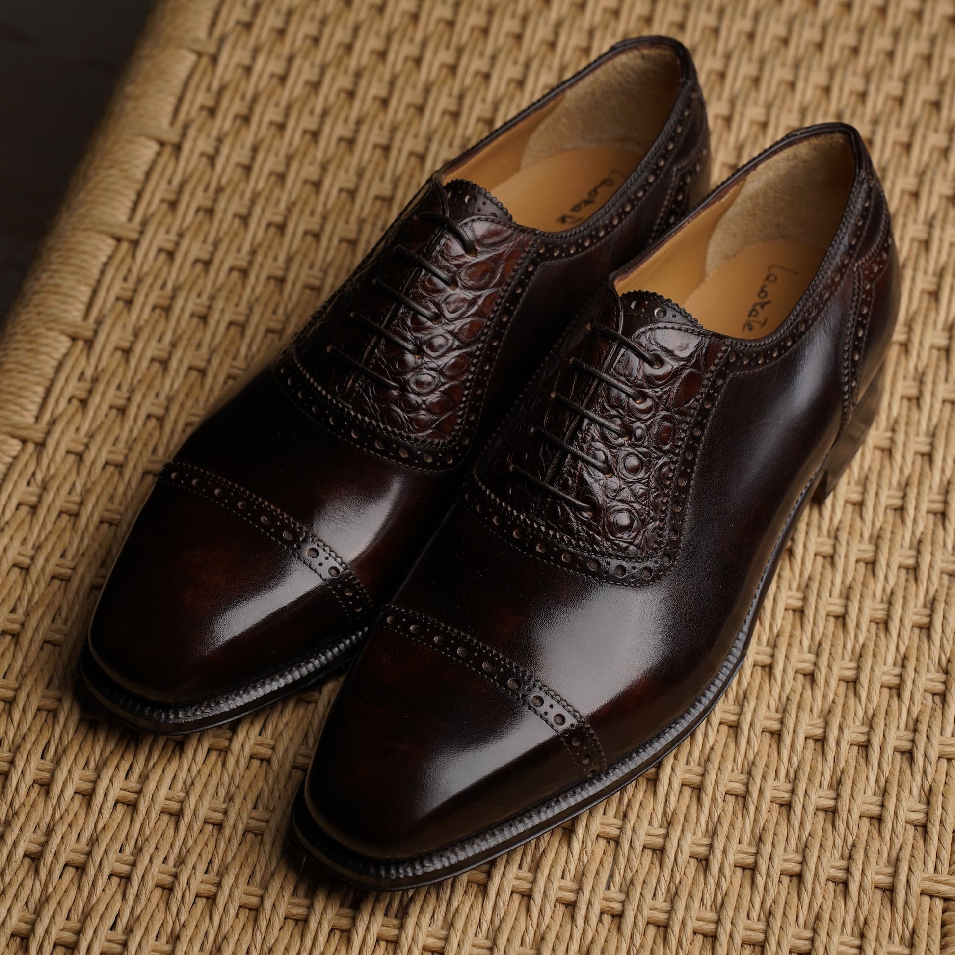 This adelaide oxford pairs dark brown museum calf with alligator leather accents, creating a striking balance between classic refinement and subtle luxury. The deep, hand-finished tones of the calf provide richness and depth, while the textured alligator panels add a discreet yet unmistakable point of interest. A sophisticated choice for those who appreciate elevated details without excess.